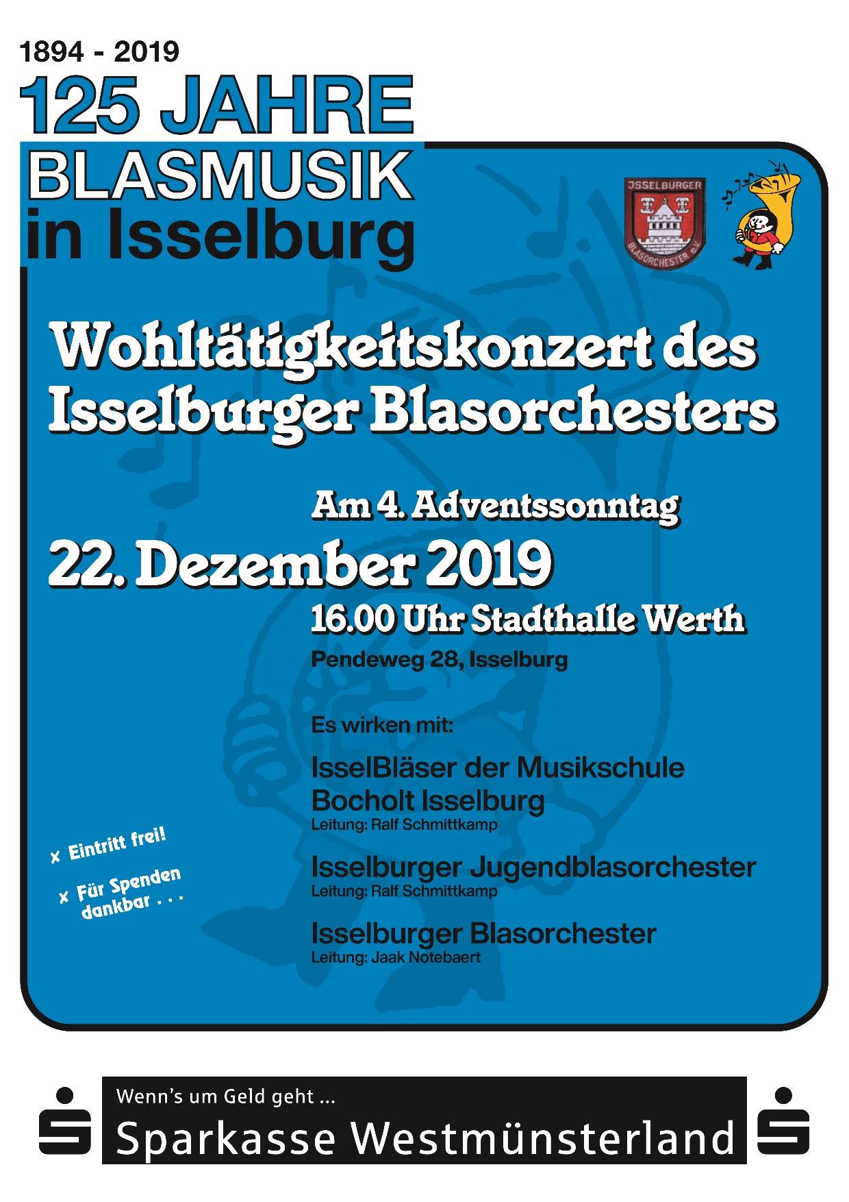 Herzliche Einladung zu unserem traditionellen Wohltätig-keitskonzert am 4. Adventssonntag. Das Konzert findet am 22.12.2019, ab 16:00 Uhr, in der Stadthalle Werth statt.