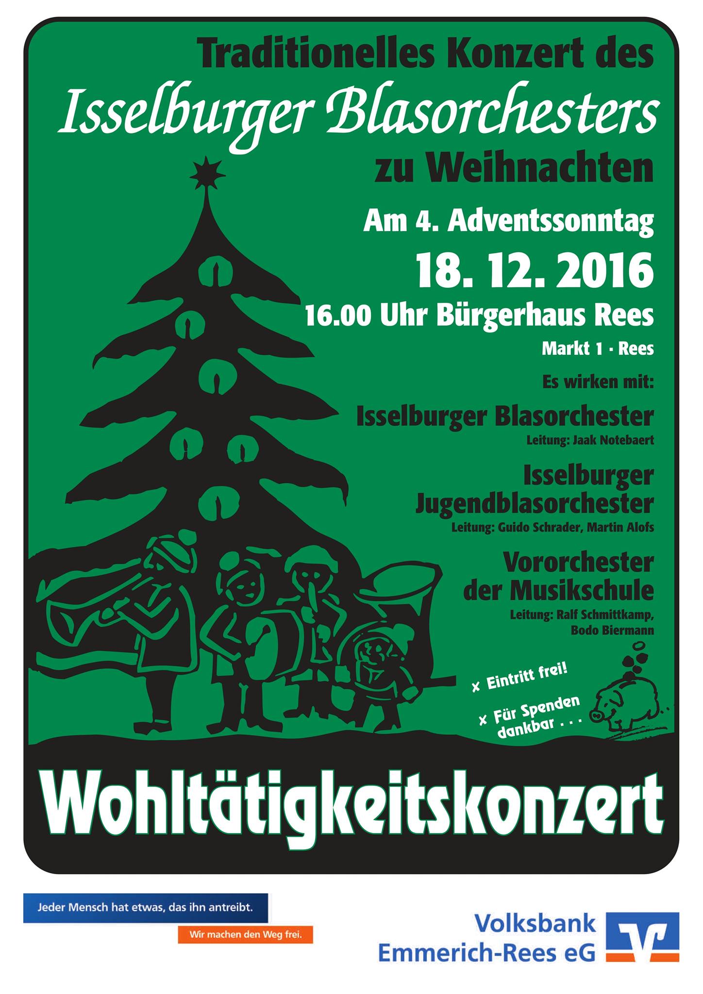 Wir laden Sie recht herzlich zu unserem traditionellen Wohltätig- keitskonzert am 4. Adventssonntag ein. Das Konzert findet am 18.12.2016, um 16:00 Uhr, im Bürgerhaus Rees statt.