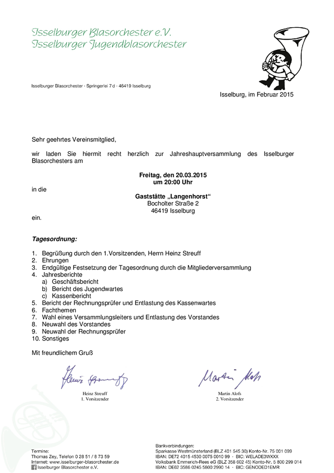 Am Freitag, den 18.03.2016 laden wir zur Jahreshauptversammlung des Isselburger Blasorchesters um 20:00 Uhr, in der Gaststätte Langenhorst (Isselburg-Heelden) ein.