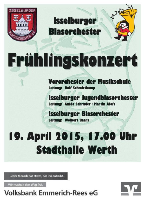 Wir möchten Sie herzlich zum Frühlingskonzert am 19.04.2015, ab 17:00 Uhr, einladen. Das Konzert findet in der Stadthalle Werth statt.