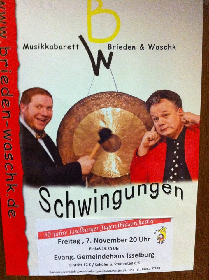 Das Isselburger Blasorchester präsentiert das Musik-kabarett “Brieden & Waschk“. Dieses musikalische Highlight wird im Rahmen der Jubiläumsfeierlichkeiten des Jugendblasorchesters präsentiert. Ihre Lachmuskeln werden sicherlich strapaziert. Sichern Sie sich frühzeitig eine Eintrittskarte zu diesem Event (Erwachsene 12€, Jugendliche und Studenten 8€), die Anzahl der Karten ist begrenzt. Die Veranstaltung findet am 7.11.2014, ab 20:00 Uhr, im evangelischen Gemeindehaus Isselburg statt (Einlass ab 19:30 Uhr).